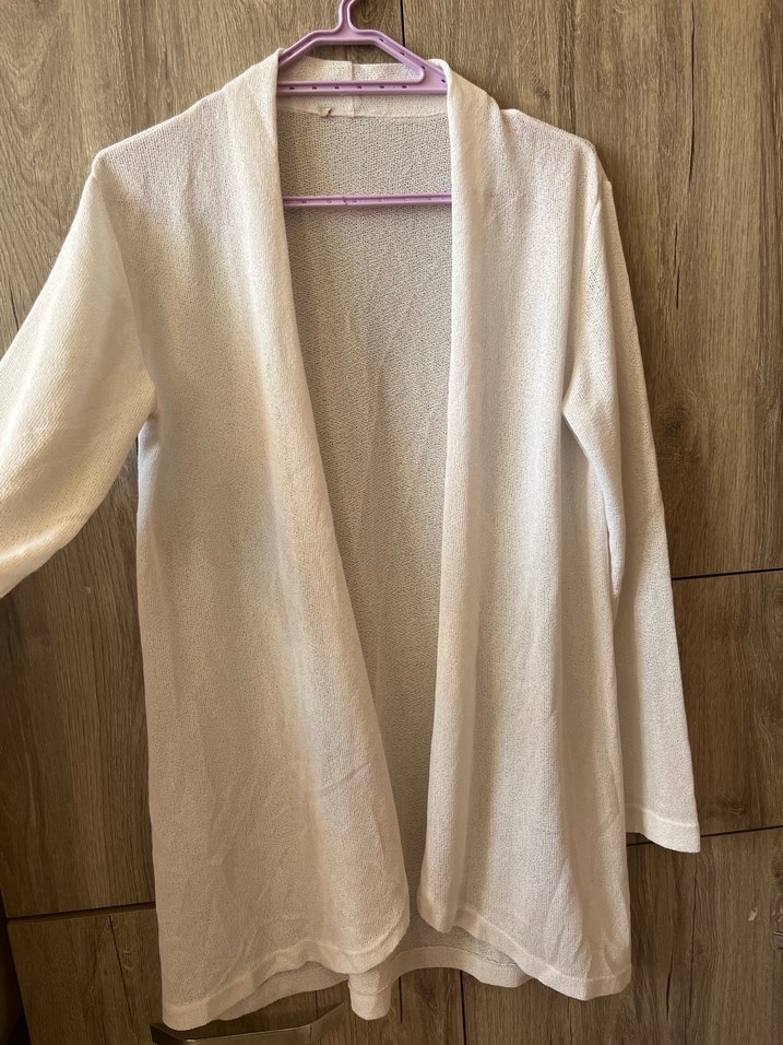 Uzun kollu, beyaz keten hırka, bol kesim ve V yakalıdır. Drapeli ön kısmı ve midi boyu ile rahat, bohem tarzda günlük kullanıma uygundur.