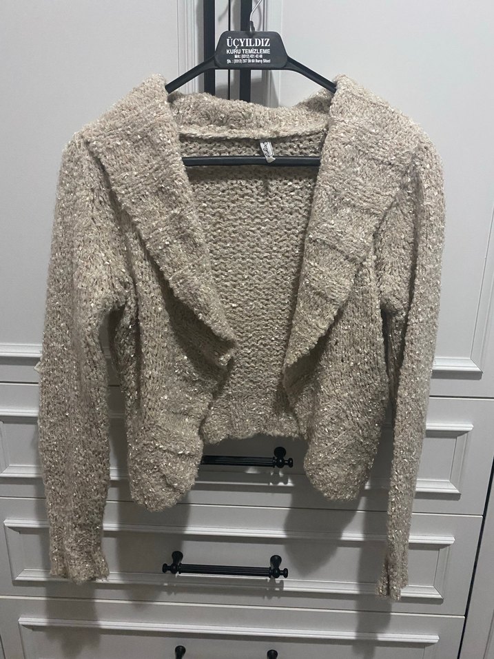 Bej renkli, fitted kesim örgü kadın hırka, uzun kollu ve açık yaka detaylıdır. Kısa boyda olup, günlük ve sokak stiline uygundur. Örgü kumaşı rahat ve desensizdir. xs ve s bedene uygundur