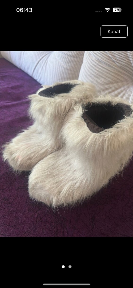 Kadınlar için kürk detaylı, yumuşak ve sıcak kumaştan yapılmış botlar. Koyu beyaz renkte olup bohem tarzına uygundur. 40 numaraya kadar olur