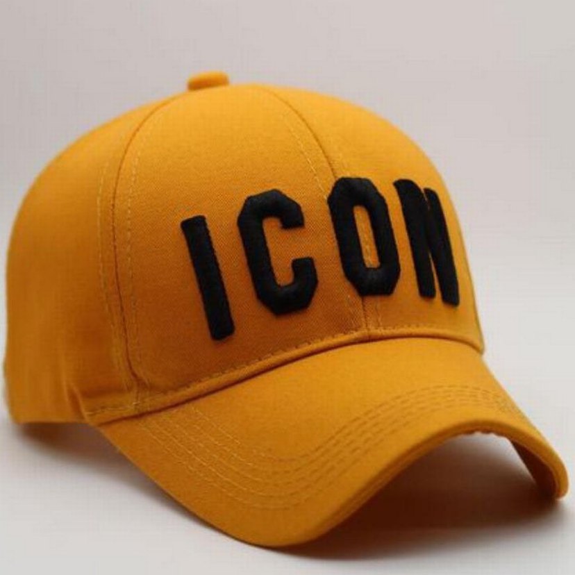 Sarı renkte, siyah ICON nakışlı kadın şapkası. Rahat kesimi ve minimalist sokak stiliyle dikkat çekiyor.