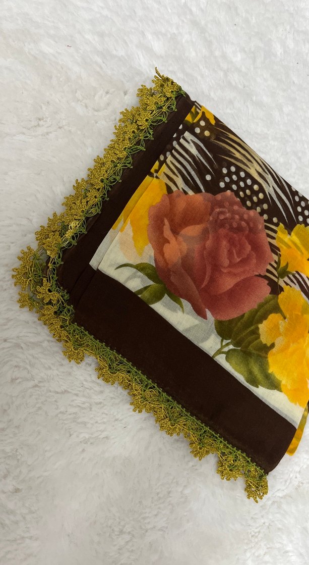 Koyu kahverengi zemin ve çiçek desenleriyle bohem tarzda kadın fuları, yumuşak sentetik kumaştan fırfırlı kenarlara sahiptir.