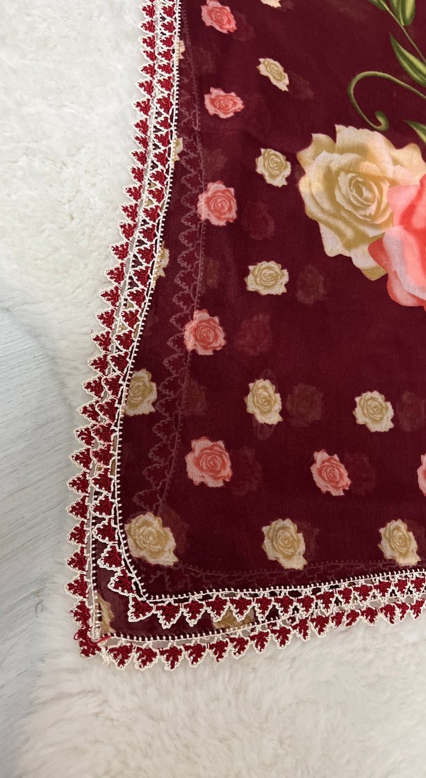 Bordo renkli, çiçek desenli kadın fular, yumuşak sentetik kumaştan ve ince dantel detaylı kenarlara sahip. Bohem ve retro tarzlara uygundur.