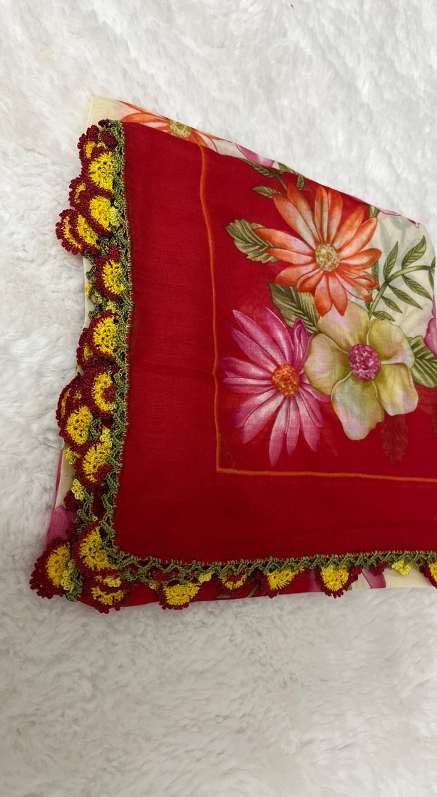 Çiçek desenli, dantel kenarlı renkli bohem kadın fularıdır. Kumaşı tekstildir.