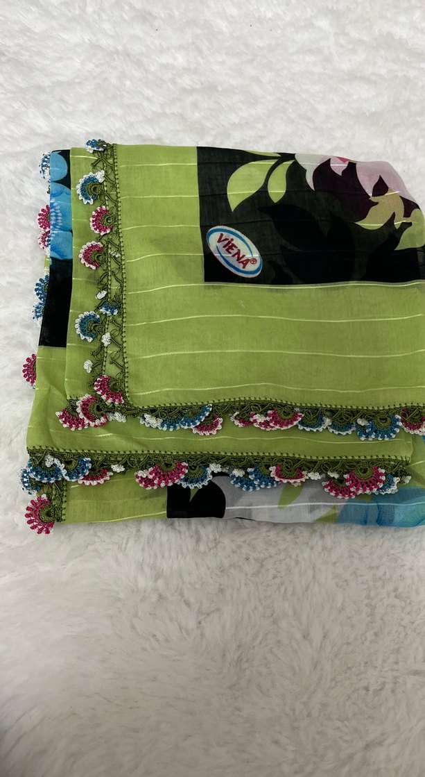 Kadın şalı, çok renkli tekstil kumaş ve ince dantel kenarlarıyla bohem ve retro tarzını yansıtıyor.