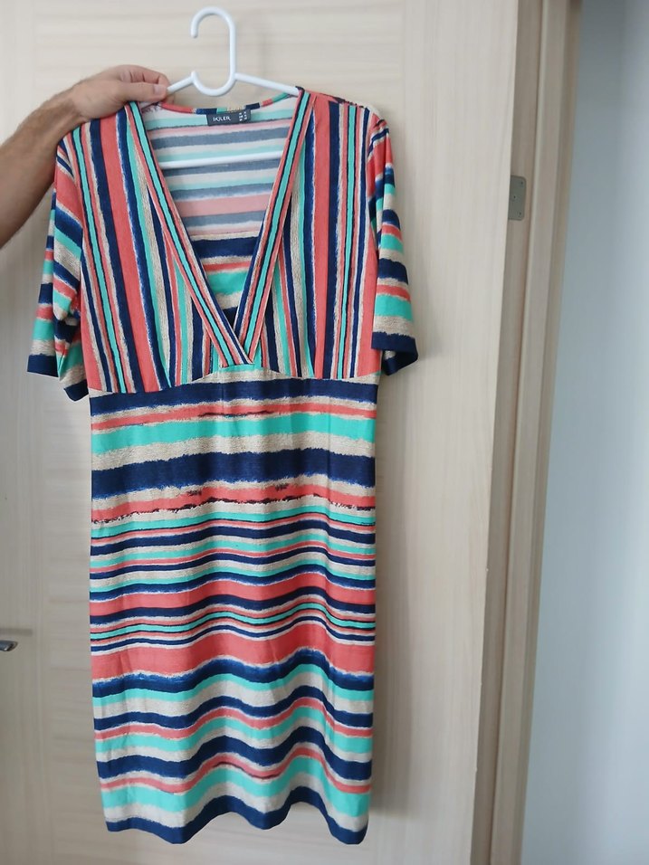 V yaka, kısa kollu, renkli çizgili desenli ve vücuda oturan kesim, 3, 5 ke giyilmiştir defosu yoktur