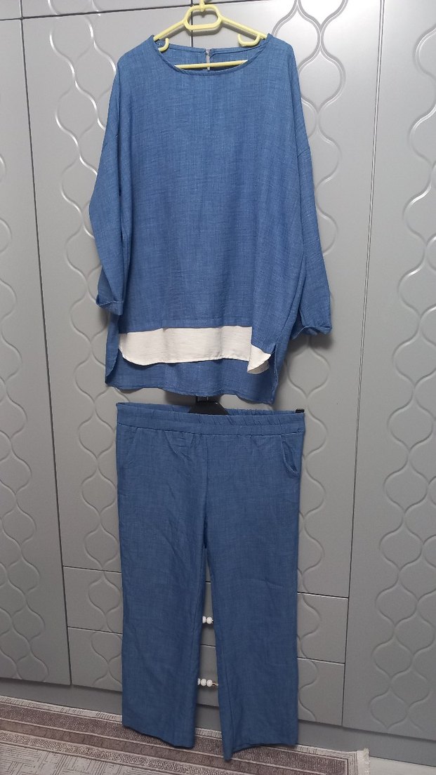 Mavi renk, uzun kollu, yuvarlak yaka kadin ikili takımı, rahat kesim ve alt kısmında beyaz detay ile sade tasarım.