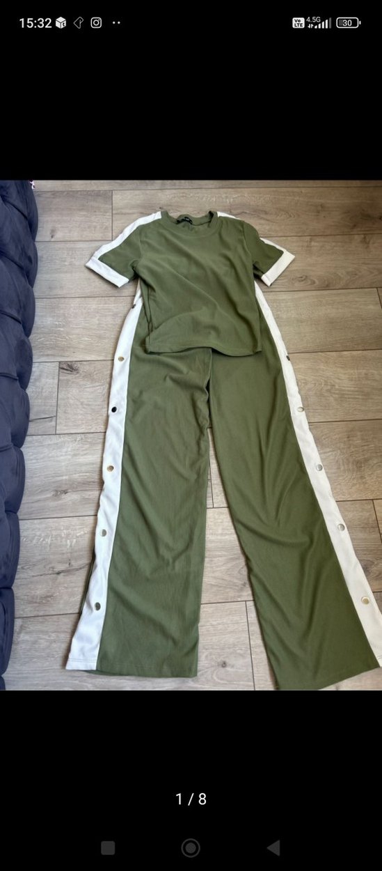 Kadınlar için regular fit, uzun boy, kısa kollu, yeşil takım. Yanlarında beyaz şerit ve düğmeler bulunur. hic kullanılmadı xl beden yazıyor ama s ve m bedene uygundur marka temsilidir