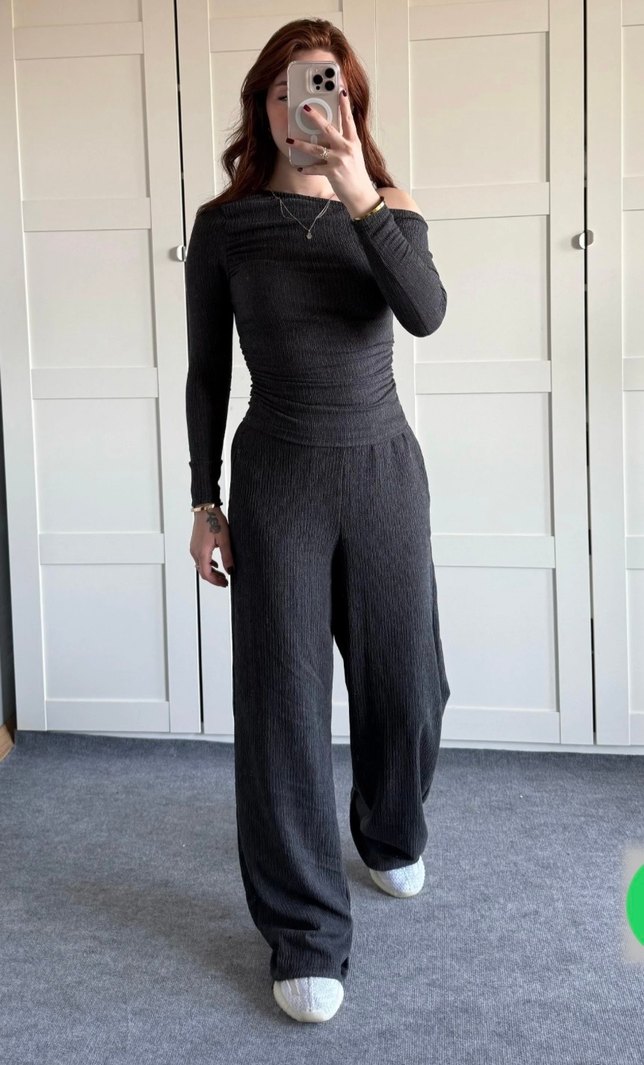Yumuşak keten kumaştan, pilili detaylara sahip, uzun kollu ve yüksek yaka gri rahat kesim günlük kullanım için uygundur. 50 kgye kadar olur sorunu yoktur