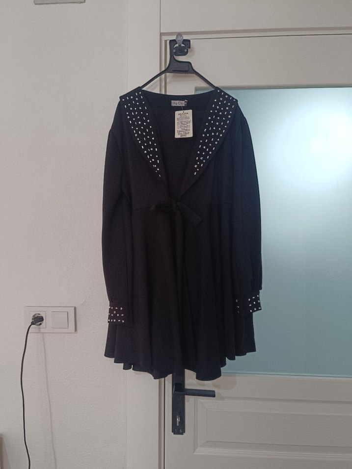 Uzun kollu, siyah midi ceket ve ispanyol paça pantolon tayt.Yaka ve manşetlerde taş detayları bulunan, yumuşak ve sıcak kumaştan üretilmiş bol kesim.Işıkta parlıyor yeni ve etiketli.