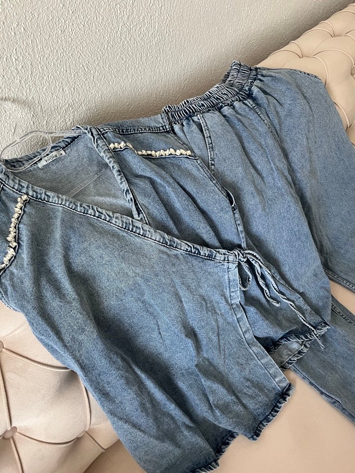 Taş Detaylı Kot Takım Şık ve rahat üst+pantolon ikilisi Pantolon normal paça Kalıbı çok güzel ve rahat Sadece bir kez kullanıldı. Bu kombini seveceksiniz.