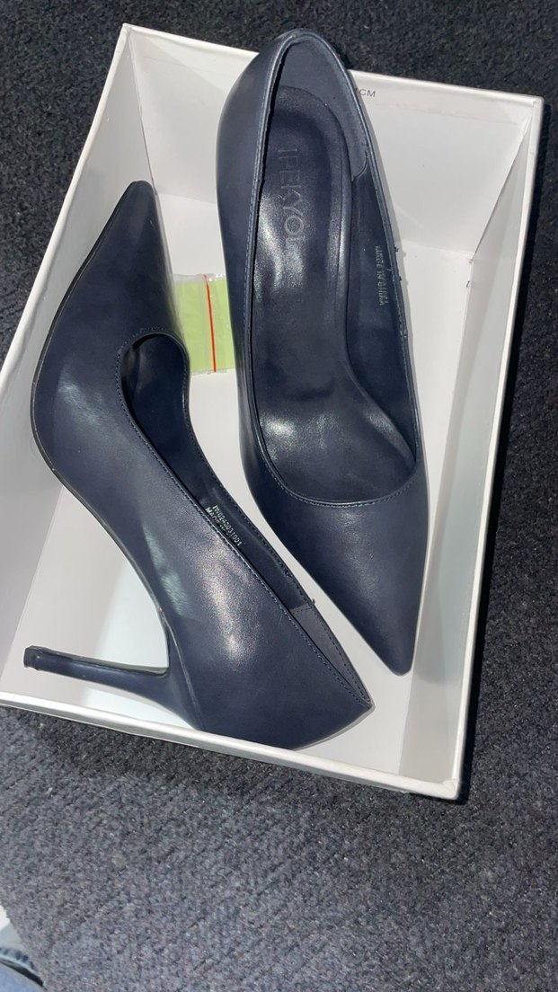 Lacivert stiletto topuklu ayakkabılar, sivri burun ve kauçuk tabanlıdır. Ofis için cesur ve çağdaş tarzda, baskılı desen ve tokalı detay içerir. İpekyol