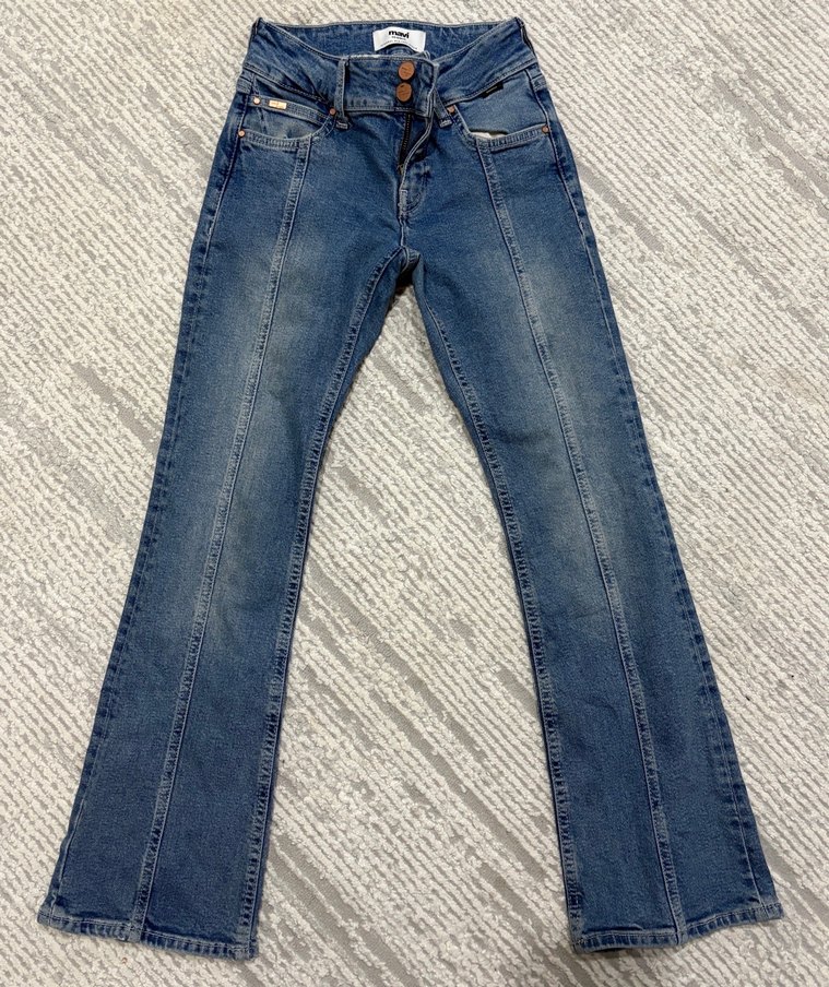 Düğmeli, normal kesim mavi denim kadın jean. Gri tonlarda hafif batik desenli, gündelik kullanıma uygun rahat bir model.