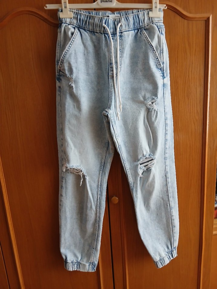 hiç kullanılmadı yeni Bol kesim, pastel mavi renkte, kemerli ve yırtık detaylı midi boy denim pantolon. Günlük kullanım için rahat ve sokak stili uyumlu.