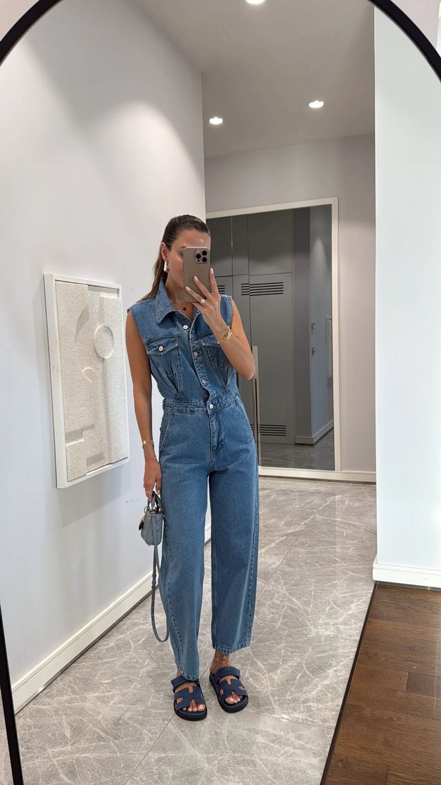 Kadınlar için mavi denim tulum, kolsuz ve tasarımıyla midi boyda ve rahat kesimdedir. Desensiz kumaşı günlük kullanıma uygun trend görünüm sunar. Rahat ve şık sokak stili. Marka tems