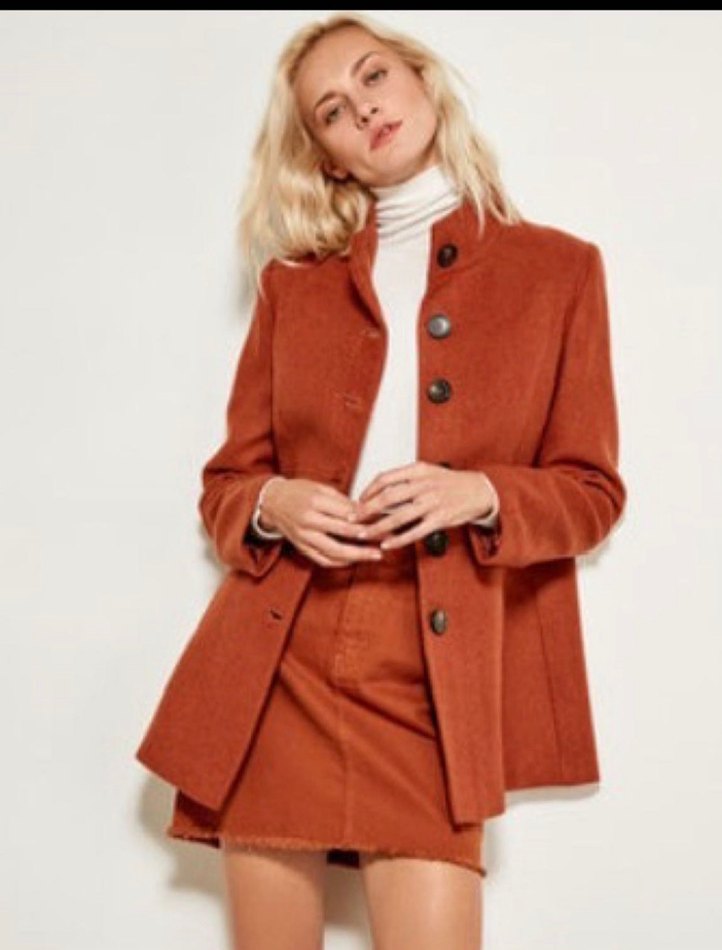 Kısa kesim, düğmeli ve kesik yakalı kadın süet kaban. S beden, kiremit rengi. Az kullanıldı.