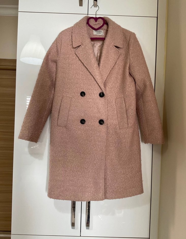 Pudra renginde, çift düğmeli ve yan cepli, yumuşak dokulu kaban. Soğuk havalar için uygun bir dış giyim parçası.