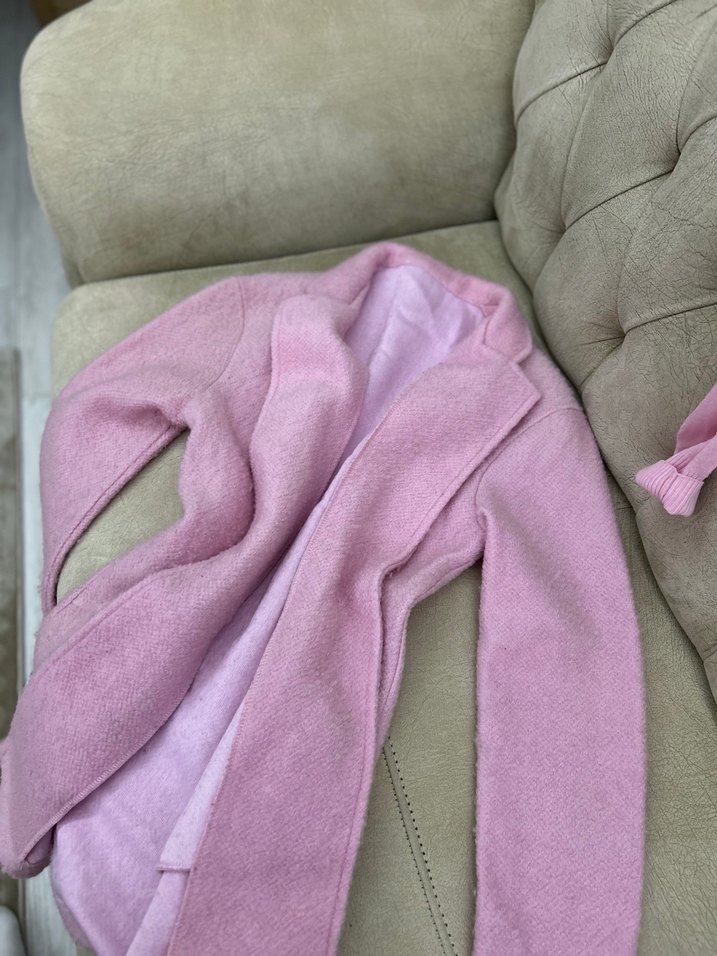 Pembe renkli, triko dokulu kadın kaban. Notlu yaka ve uzun kollu, normal kesim ve midi boyda, günlük rahat kullanım için uygundur. Kaşe pamuklu tarzdadır teklif için yazın