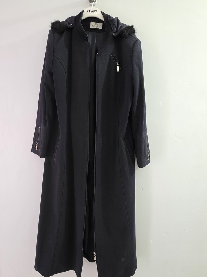 Kürk detaylı, lacivert uzun kaban, yumuşak ve sıcak kaşe kumaştan üretilmiştir.