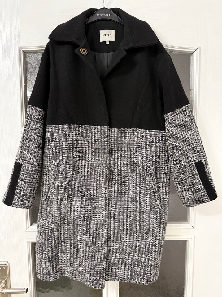 Siyah üst kısmı ve gri desenli alt kısmıyla, büyük yakalı, yan cepli bir kaban.