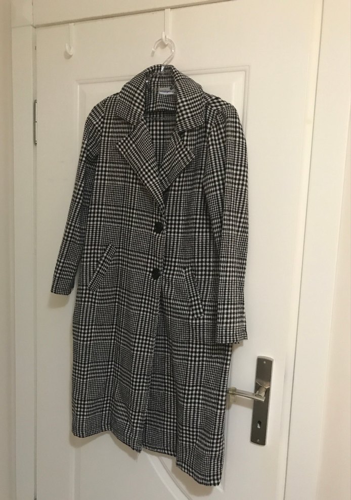 Gri ekose desenli, uzun, düğmeli ve kruvaze yakalı kadın kaban. Uzun kollu, regular fit ve sentetik kumaştan üretilmiştir.