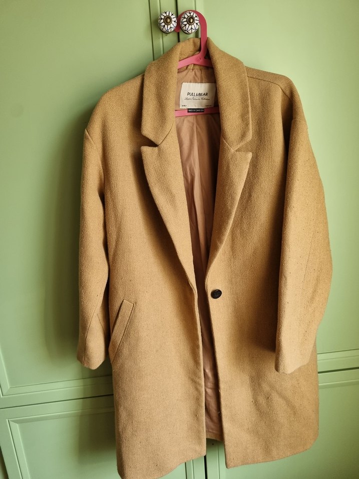Acık kahve renkte, düğmeli ve uzun kollu, normal kesim midi uzunlukta kadın kabanı. Minimalist tarzıyla ofis kullanıma uygundur. S beden, Bershka markadır, hafif tüylenmeler mevcut fotograflarda belirtttim