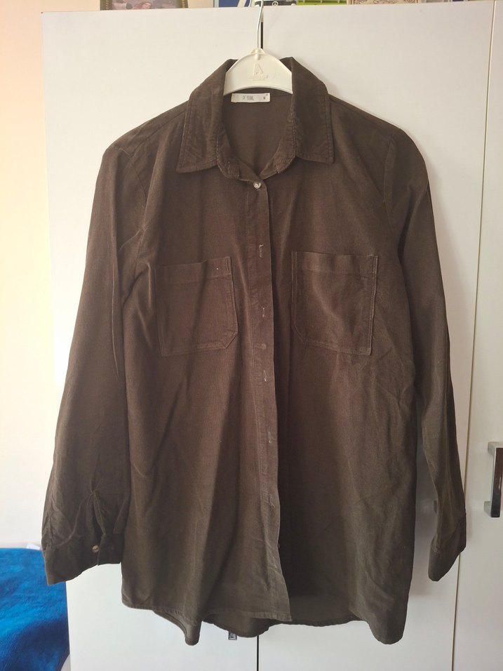 kadife kumaştan, düğmeli, uzun kollu, yakalı ve bol kesim kadın gömleği. İki cep bulunur, günlük ve ofis kullanımı için uygundur. rengi koyu haki fotoda açık çıktı