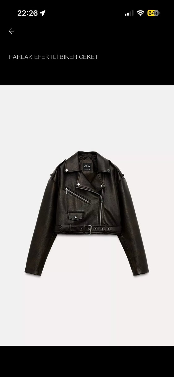 Kahve deri biker ceket, kemerli, kesik yaka ve askılı kollu. Normal kesim ve kısa boyda, gündelik kullanım için uygundur.