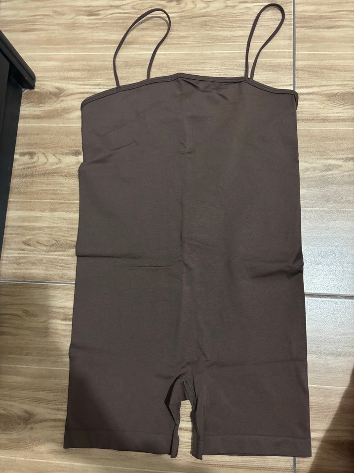 Kadınlar için kahverengi, askılı, kısa ve vücuda oturan tulum. Sentetik kumaştan, sade ve minimalist tarzda günlük kullanım için uygundur. ✨