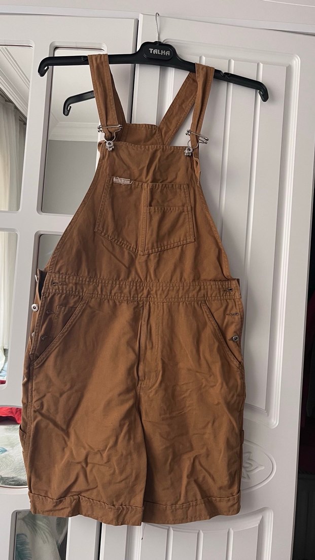 Askılı, kahverengi, parlak kumaştan yapılmış, bol kesim midi tulum. Ön cep ve tokalı detayları bulunur, günlük kullanım için uygundur.