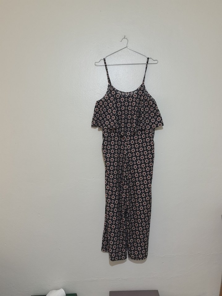 Kadınlar için askılı, bol kesim, drapeli tasarıma sahip kahverengi desenli tulum. Sentetik kumaştan üretilmiştir, bohem ve retro tarz için uygundur.