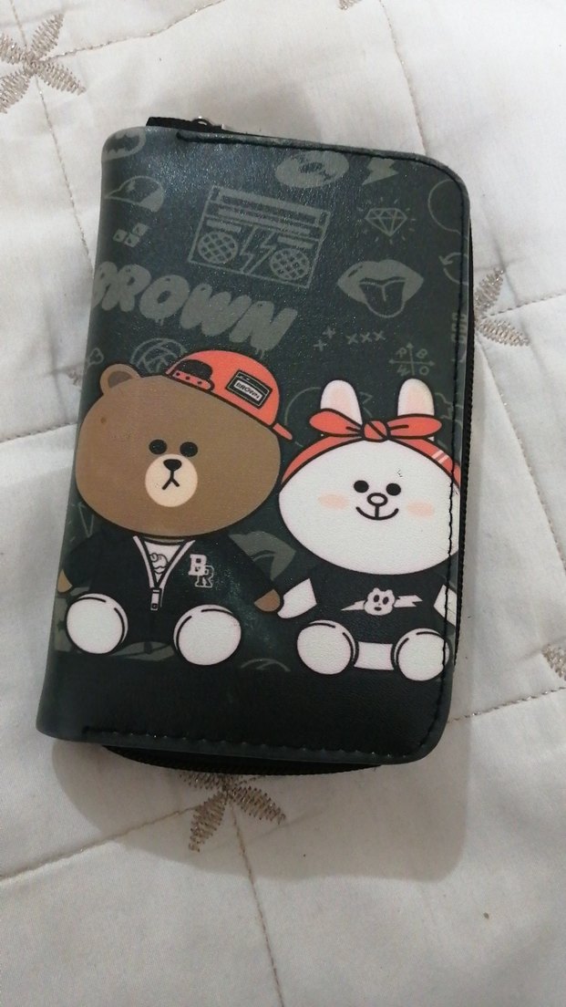 Koyu kahverengi deri cüzdan, baskılı çizgi karakterler ve fermuarlı kapanışa sahip, trend sokak stiline uygun.