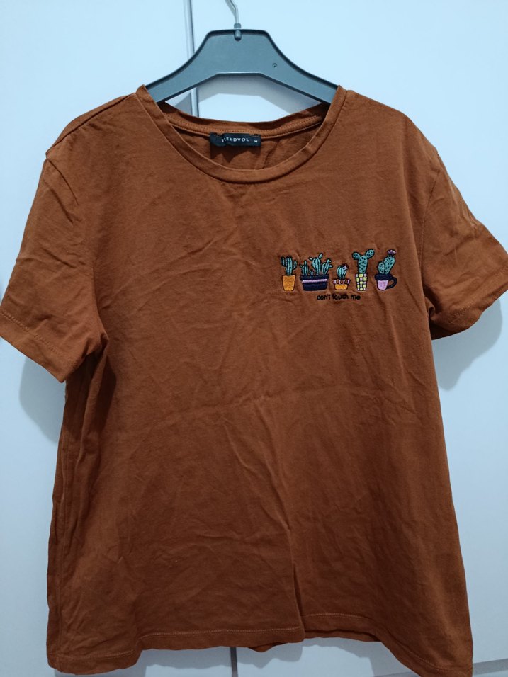 Kahverengi, kısa kollu, bisiklet yaka kadın tişörtü, göğüs kısmında küçük saksı bitkileri baskılı. Yumuşak kumaştan, rahat kesim, günlük sokak stili için uygun.