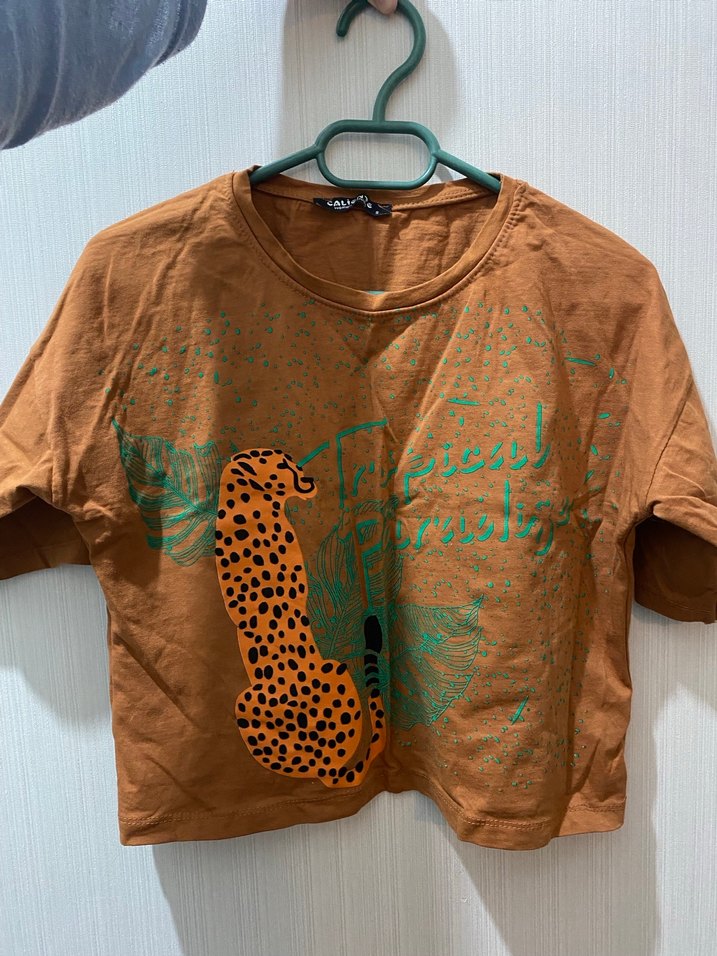 Kadın kahverengi kısa kollu tişört, bol kesim ve baskılı tasarıma sahip, yuvarlak yaka, sentetik kumaştan günlük rahat kullanım için uygun. Hiç kullanılmadı