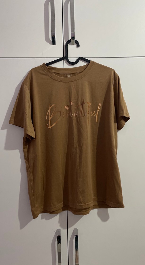 Kadın kahverengi tişört, kısa kollu, yuvarlak yakalı ve pamuk yumuşak kumaştan üretilmiştir. Parlak baskılı deseniyle rahat ve şık bir görünüm sunar. Normal, midi boyda, günlük kullanıma uygundur. (Fakat ön kısmının en alt kısmında çok ta gözle görülmeyecek bir lekesi bulunmakta )