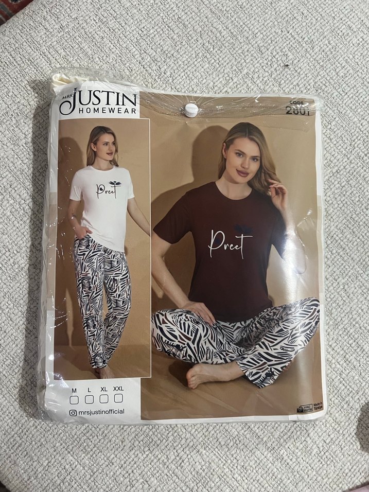 Justin Homewear markasına ait, kahverengi kısa kollu üst ve baskılı, bol kesim, midi boy pantolondan oluşan pijama takımıdır. Rahat ve sokak stili uyumlu.