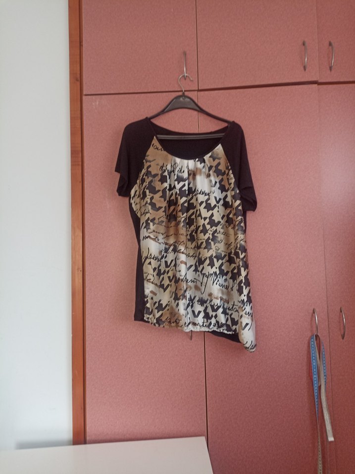 Kadınlar için kahverengi baskılı, salaş kesim kısa kollu ve bisiklet yaka bluz. Önde drapeli, midi boyda ve günlük kullanıma uygun.