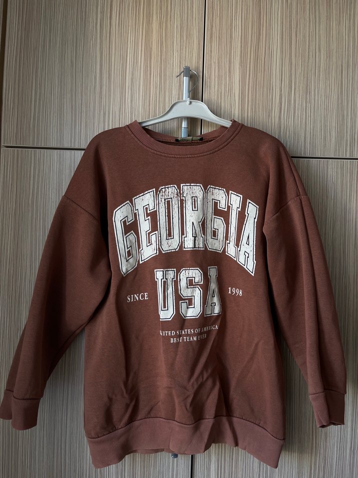 Uzun kollu, yuvarlak yakalı, rahat kesim kahverengi sweatshirt. Önünde 'GEORGIA USA SINCE 1998' baskısı var. Yumuşak ve sıcak kumaştan üretilmiştir.