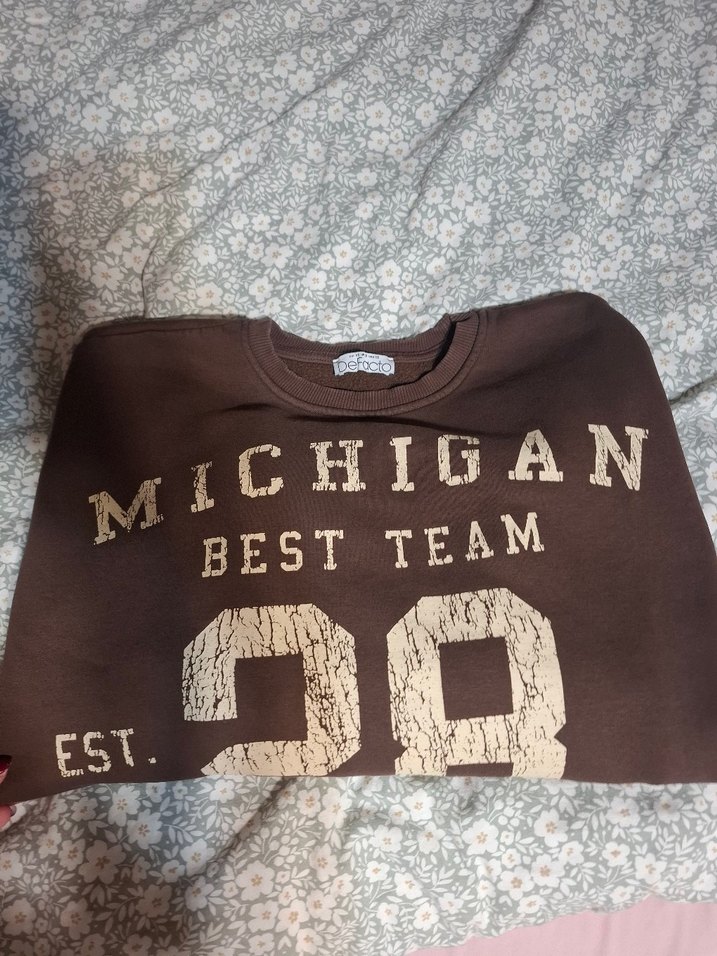 Uzun kollu, yuvarlak yakalı kahverengi kadın sweatshirtü. Baskılı, bol kesim ve örme dokulu tekstil malzemeden üretilmiştir. Günlük sokak stili için uygundur.