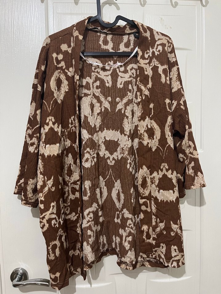 Kadınlar için bol kesim, kahverengi batik desenli kimono. Drapeli tasarım ve yaka kısmı notched lapel. Uzun kollu ve midi boy, bohem tarzı için uygun.