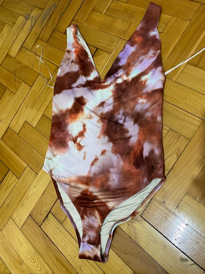 Fitted kesim, kahverengi batik desenli, drapeli ve askılı kol detaylı bohem tarzında kadın mayosu, dış mekan kullanımı için uygun.