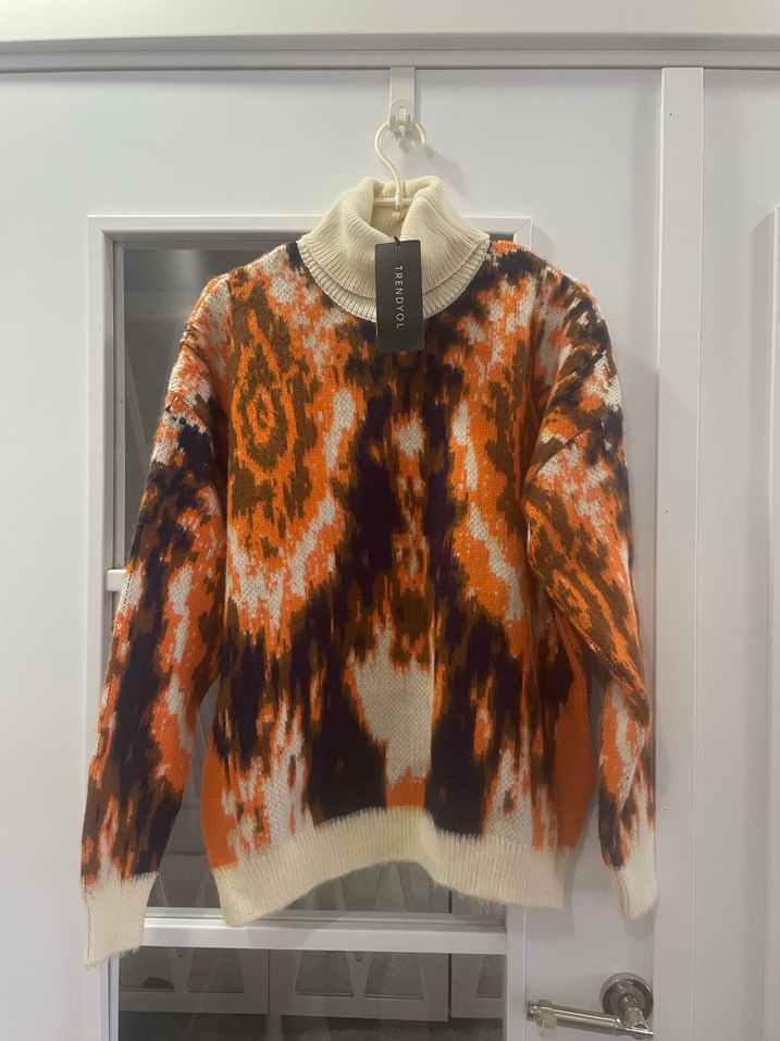 Kadın kahverengi batik desenli triko boğazlı kazak, uzun kollu ve bol kesimdir. Günlük kullanım için uygun, rahat ve şık bir sokak stili parçasıdır. Yumuşacık, kadifemsi dokusu olup tam bir kış kazağıdır