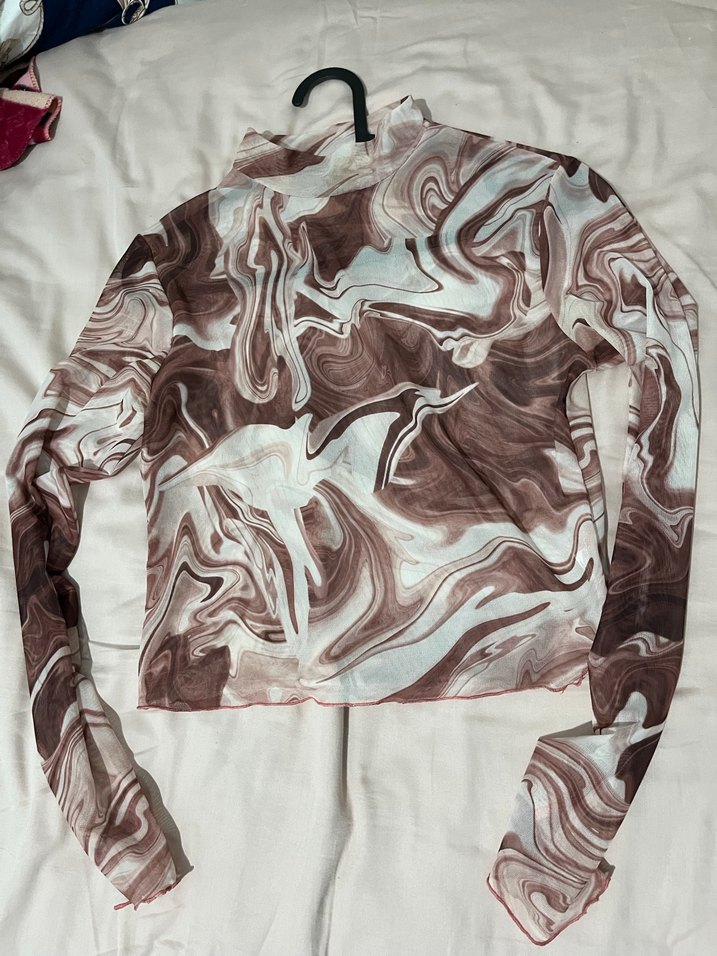 Kahverengi ve gri batik desenli, uzun kollu, boğazlı ve drapeli sentetik kumaştan yapılmış, dar kesim kadın bluz. Günlük kullanıma uygun, sokak modasına uygun tarzda.
