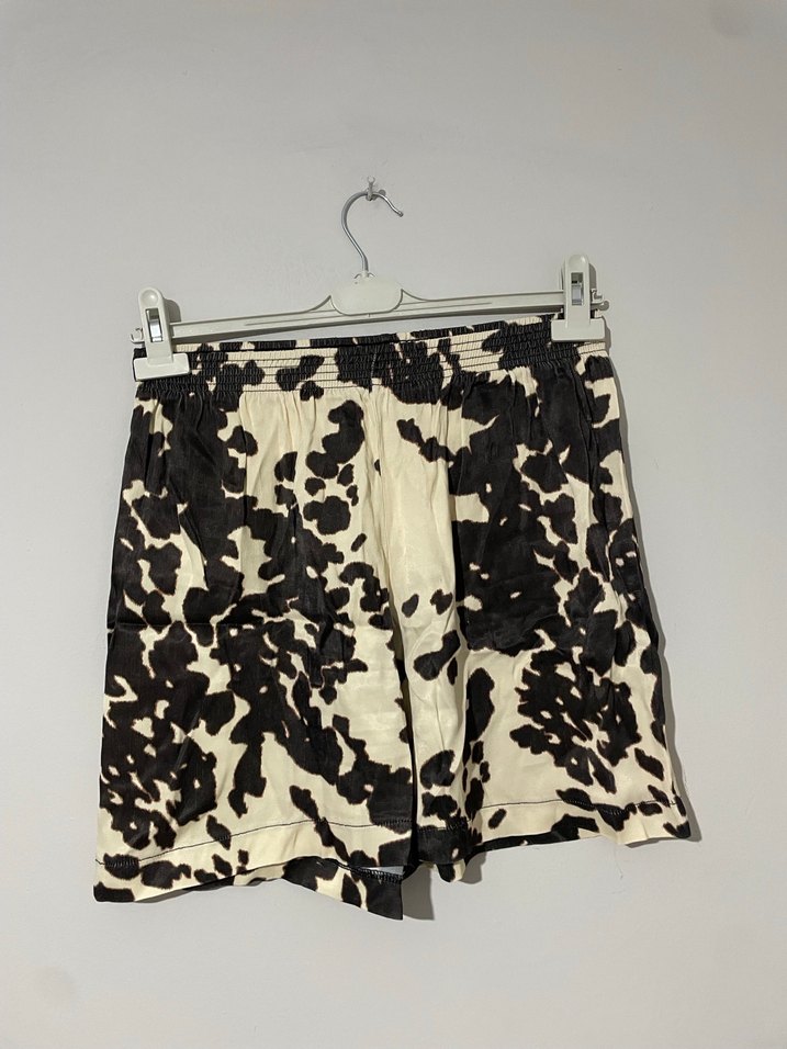 Sentetik kumaştan, kahverengi batik desenli, bol kesim kadın mini şort. M beden defosuz