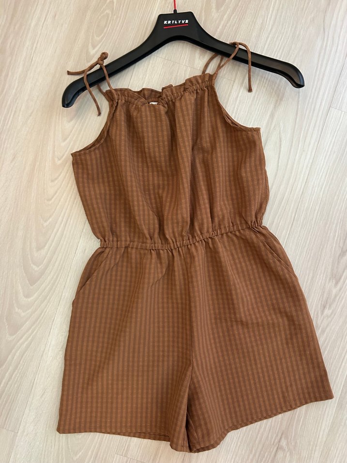 Kahverengi mini tulum, ince askılı ve kemerli bel detayıyla bol kesimdir. Sentetik kumaştan üretilmiş, bohem ve rahat tarzda günlük kullanıma uygundur.