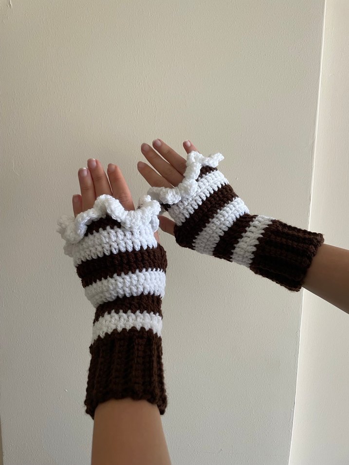 Kahverengi ve beyaz çizgili örgü kadın eldivenler, rahat ve fırfırlı tasarımla trend, avangart bir stile uygundur.