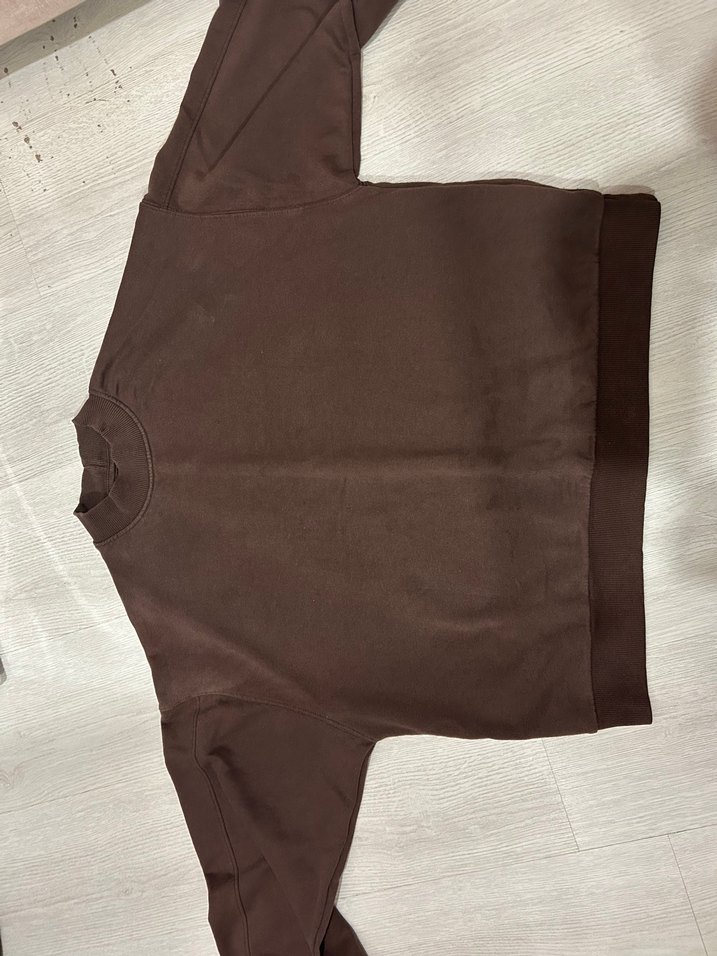 Kadınlar için bisiklet yaka, uzun kollu, bol kesim kahverengi sweatshirt. Yumuşak ve sıcak kumaştan, günlük kullanıma uygun midi boyda sade tasarım.
