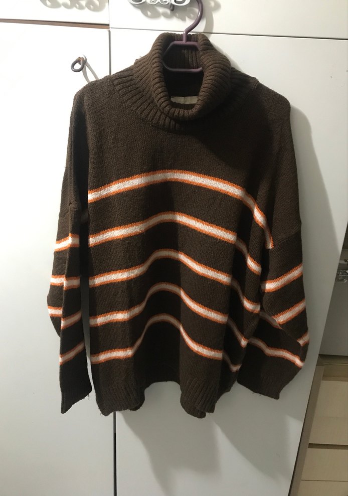 Kadınlar için kahverengi, turuncu ve beyaz çizgili, boğazlı, uzun kollu, bol kesim triko kazak. Rahat ve günlük kullanım için uygundur.