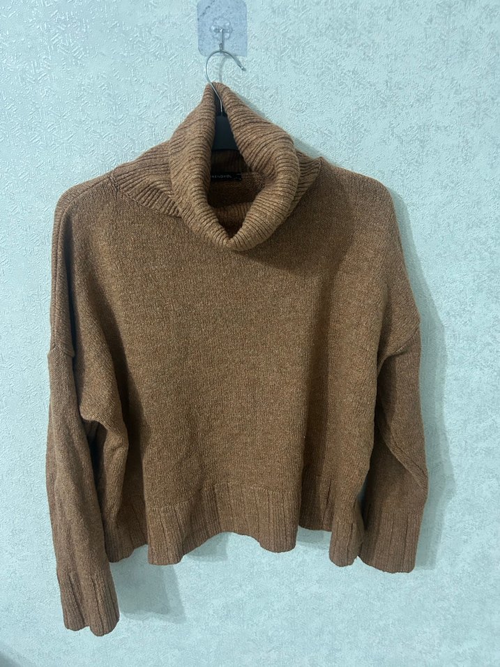 Kadınlar için kahverengi örgü yün kazak, bol kesim ve uzun kollu. Boğazlı ve normal midi boyda, günlük kullanım için uygundur.