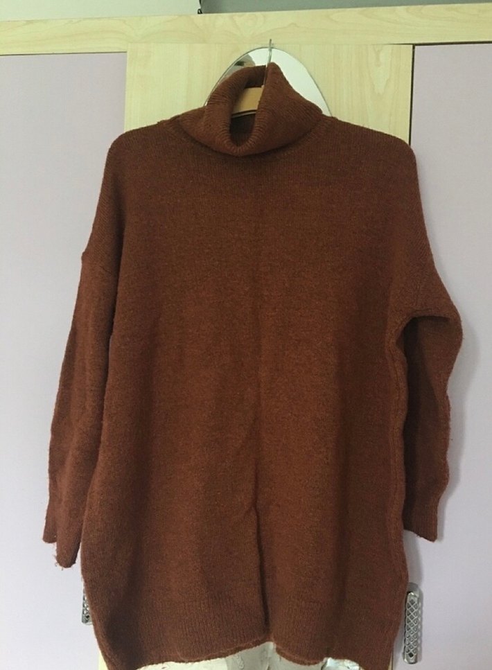 Kadın kahverengi, boğazlı, uzun kollu, yün örgü kazak. Rahat kesim ve normal midi boyuyla günlük kullanıma uygundur.