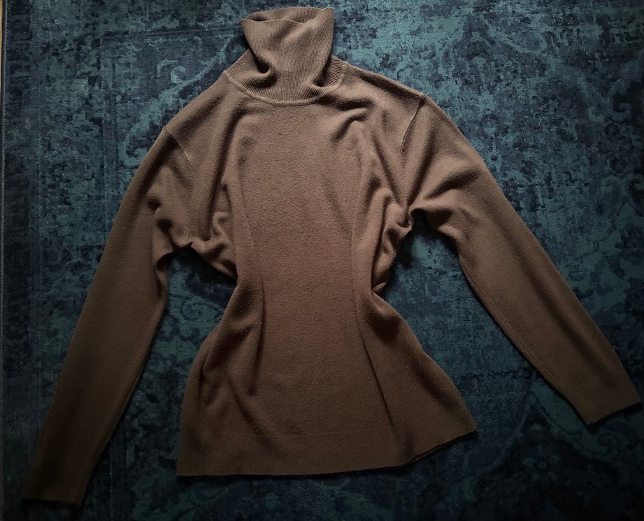 Kahverengi, boğazlı, uzun kollu, rahat kesim örme kazak. Yumuşak ve sıcak kumaştan, günlük kullanım için uygundur.